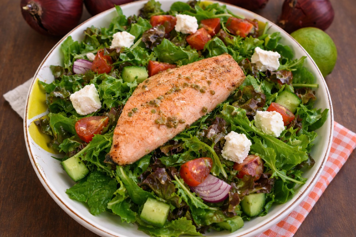 Somonlu salata, Akdeniz yeşillikleri ve mevsiminde sebzelerle somon filetonun birleştiği, doyurucu bir öğün. Proteinli salata kategorisinin yıldızı olarak kabul edilir. Omega-3, vitamin ve mineral dengesiyle bedeni besleyen bir salata türü olarak, sporcular tarafından da sık sık tüketiliyor.