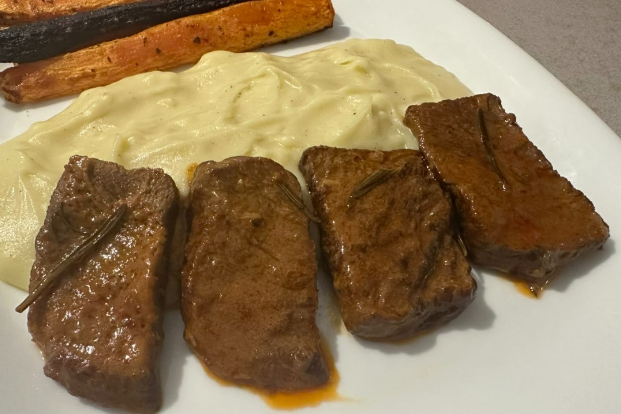 - Aynı tavaya 1 yemek kaşığı tereyağını koyuyoruz, eriyince et dilimlerini ekleyip hafifçe çeviriyoruz. Burada amaç eti pişirmek değil, sadece tereyağıyla kaplamak. Ardından etleri tekrar tavadan alıyoruz.