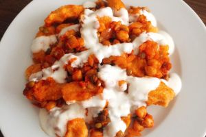 Bulgurdan hazırladığımız ve suda haşlayarak pişirdiğimiz köfteler var, içinde haşlanmış yeşil mercimek ve nohut var. Üstünde bir de sarımsaklı yoğurt var ki işte o zaman zirveye oynuyor.