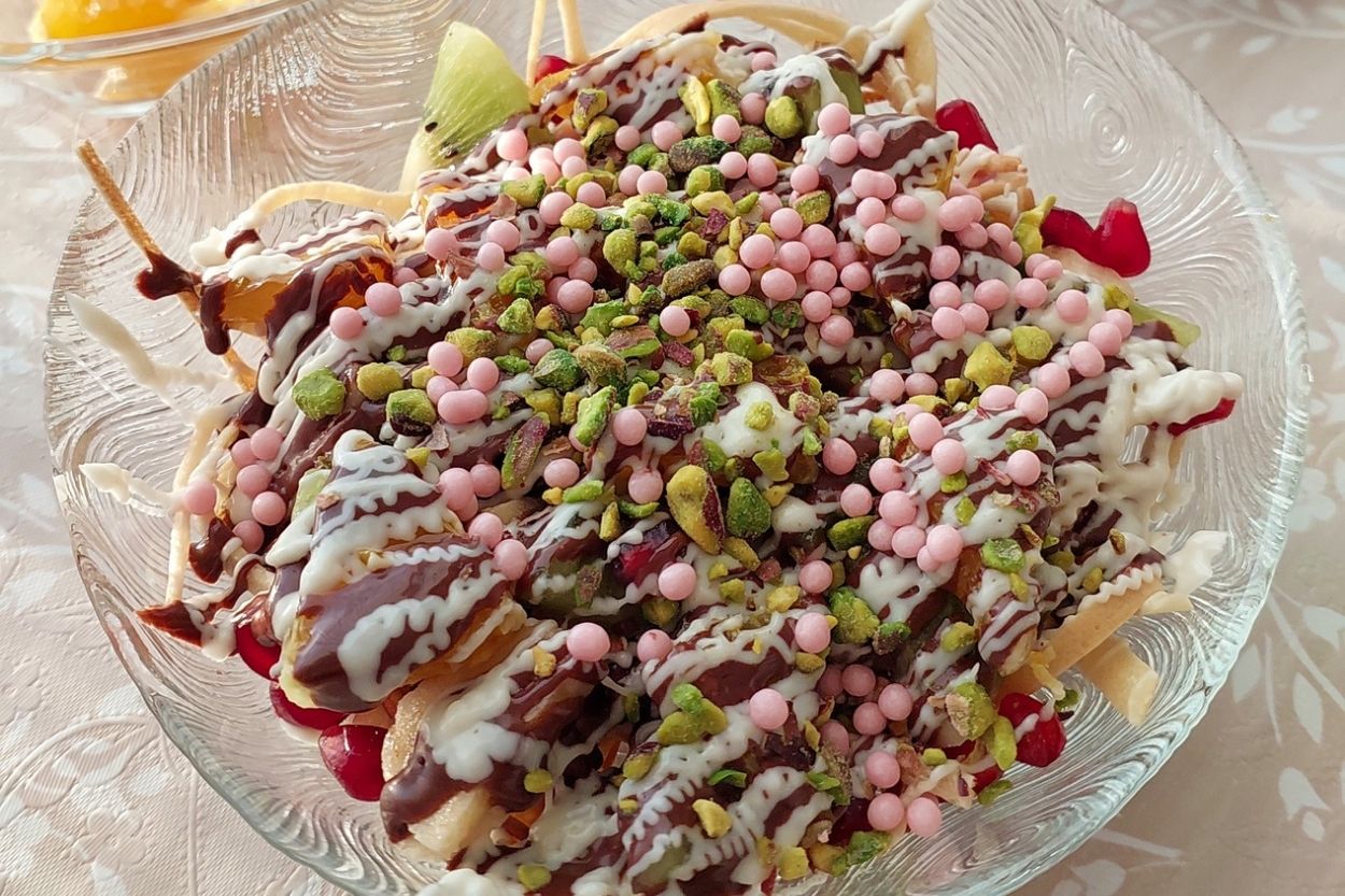 - Sevdiğimiz meyveleri doğrayalım ve hazır edelim. Pişen spagetti waffle’larımızı porsiyonlayalım ve üzerine meyveleri serpiştirelim. Üzerine çikolata sosu gezdirelim ve servis edelim.