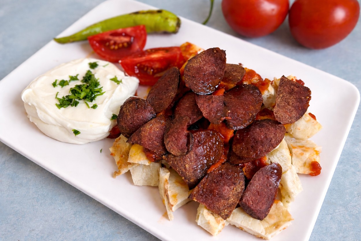 Her halükarda, tereyağında kavrulmuş salça, kızarmış sucuk dilimlerinin üzerine yayılacak, onlar da tabii pidenin üzerinde sıralanıyor. Yanına bir de yoğurt eklendiğinde, tam bir iskender oluyor kendisi. İşte bu yüzden sucuklu İskender tarifi, klasik İskender’i aratmayacak da diyebiliriz. Hatta kahvaltılık olarak bile yenebilir.