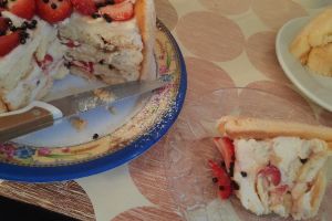 - Pandispanyanın ikinci katını gene aynı şekilde kremanın üstüne kapatıp sütle ıslatın ve çikolata kreması sürün. Bu sefer hazırladığımız kremşantinin yarısını sürün ve çilek doğrayın.