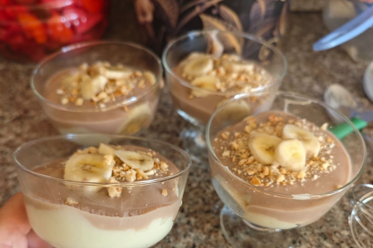 - Bardağın en altına beyaz muhallebiden ekleyelim. Üzerine çikolatalı muhallebiyi dikkatlice ilave edelim.