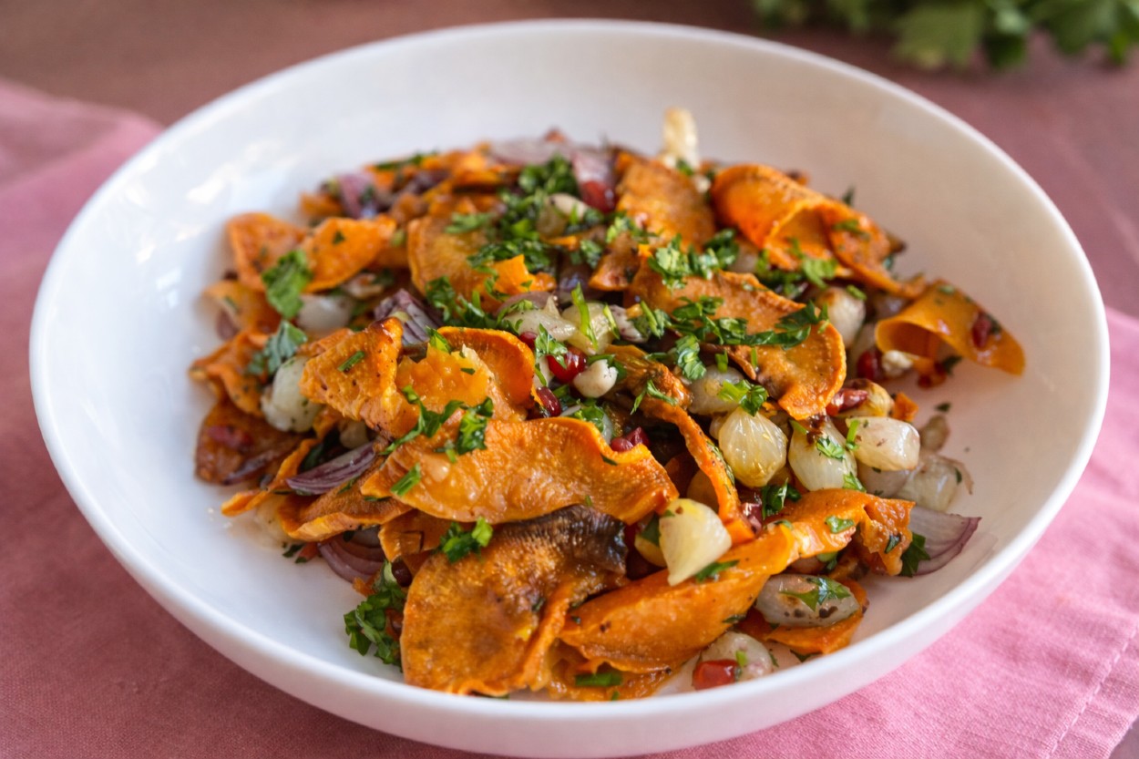 Fırında pişirilmiş tatlı patateslerin yumuşak dokusu ve doğru baharatların birleşimiyle ortaya iştah açıcı bir salata çıkıyor. Görsel görünümüyle dikkat çekerken, sebze ve meyvelerle sofralarınıza renk katabilirsiniz. Ana yemekleri dengeleyecek ve kase kase yedirme hissi bırakacak sizde.