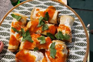 Tavuğun en güzel hali bu yemek! Minik minik doğranmış tavuklar, biberler ve soğanlar bir tavada birleşiyor; incecik yufkanın içerisine konuluyor ve sarılıyor. Üzerine de salçalı sosu gezdirince işte yemek hazır!