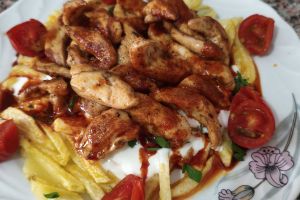 İncecik kızartılmış kibrit patateslerin üzerine dökülen sarımsaklı yoğurt, ona yumuşaklık ve denge kazandırırken, tavada mühürlenmiş baharatlı tavuk dilimleri ile buluşarak âdeta damak çatlatan bir lezzet ortaya çıkarıyor. En üste gezdirilen tereyağlı kırmızı biber sosu da bu lezzeti zirveye taşıyor.