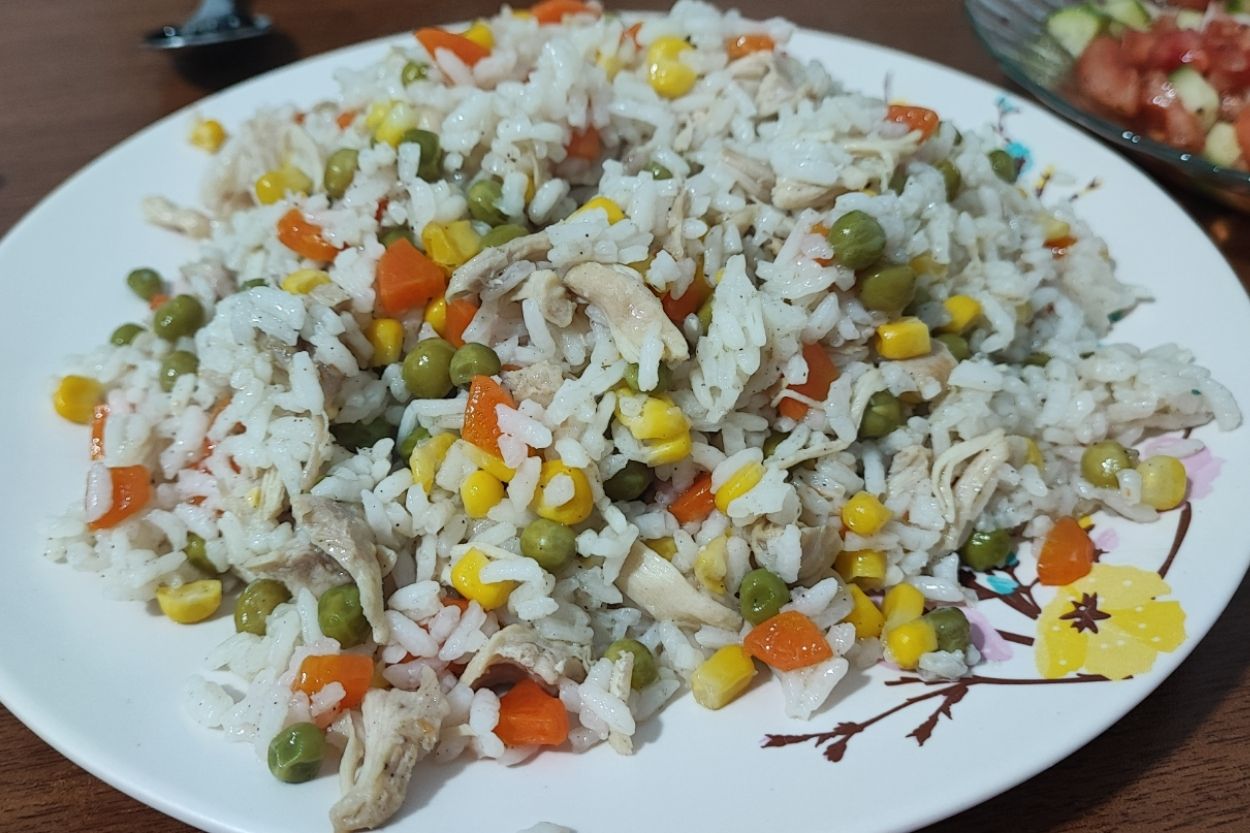 Tavuklu sebzeli pirinç pilavı tarifi, pratik yapılışı ve enfes lezzetiyle akşam yemeği sofralarının favorisi. Tane tane pirinç, haşlanmış tavuk ve sebzelerle buluşunca ağızda şölen yaratırken, rengarenk görseliyle iştah açıyor.