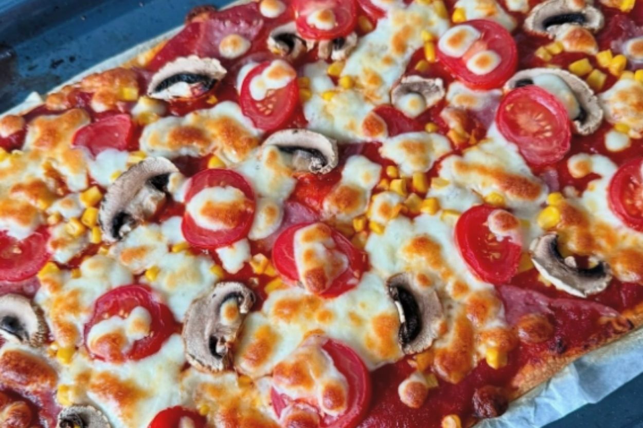 - Önceden ısıtılmış 180 derece fırında, pizzamız güzelce kızarana kadar yaklaşık 20-25 dakika pişirelim. Dilimleyip sıcak servis edelim. Tepside ev pizzası hazır! Afiyet olsun.