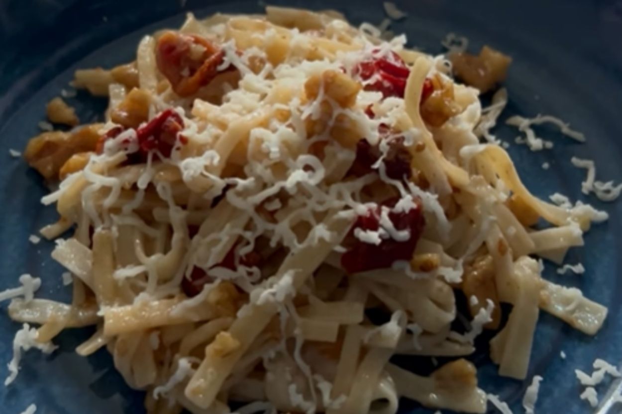 - Sıcak olarak servis edelim. Tulum peynirli kuru domatesli erişte hazır! Afiyet olsun.