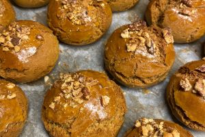 - Elinizi yağlayarak mandalina büyüklüğünde parçalar alarak yuvarlayın. Yumurta sarısını sürüp ceviz ekleyin.