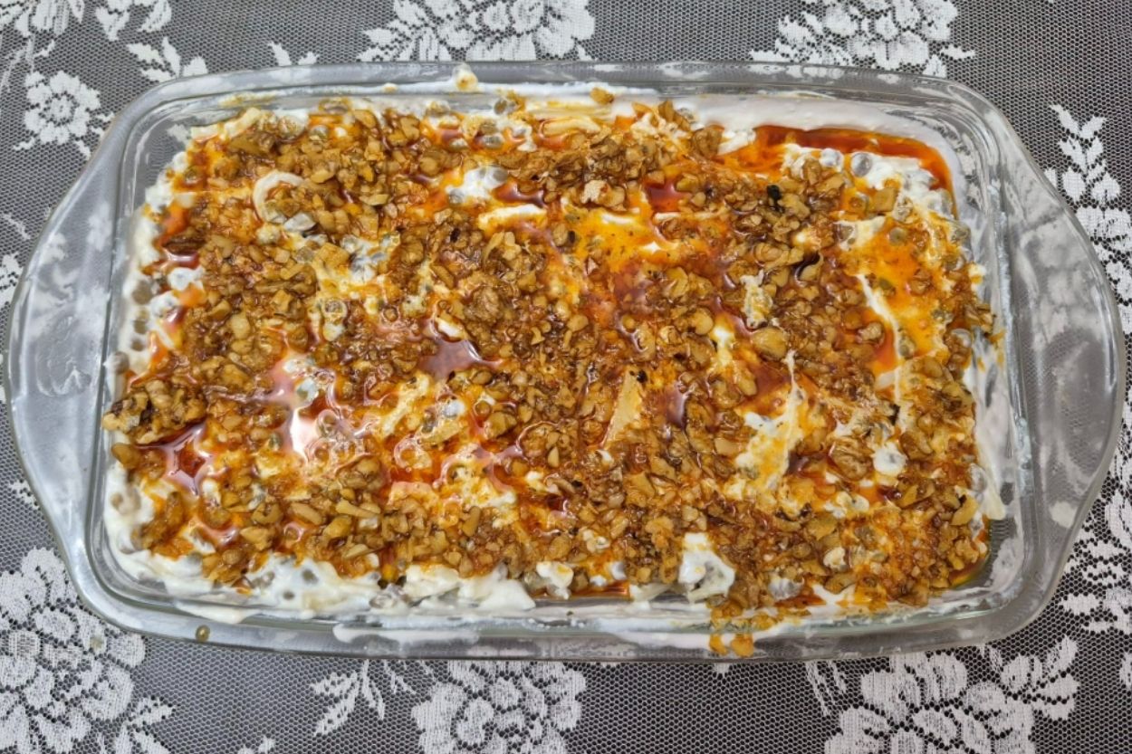 - Yoğurtlu karışımın üzerine cevizli yağ gezdirilip servis edilir. Yeşil mercimekli erişteli meze hazır! Afiyet olsun.