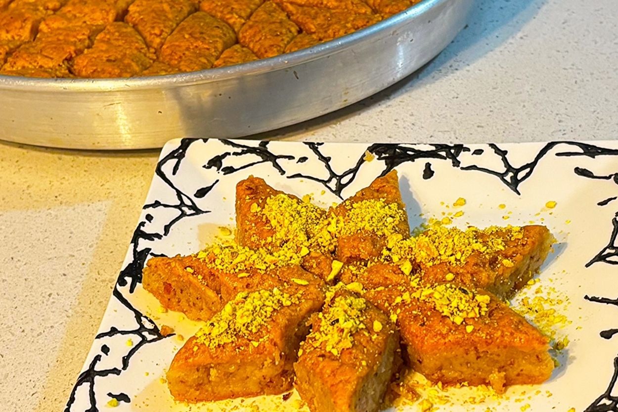 - Üzerini toz Antep fıstığı ile süsleyerek servis edin. Yufkasız baklava hazır! Afiyet olsun.