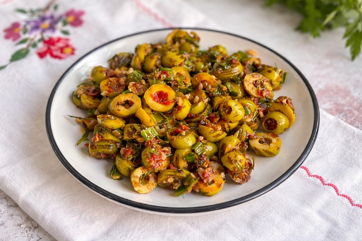 Zeytin piyazı, görselliğiyle de büyüleyicidir. Dilimlenmiş yeşil zeytinlerin ve iri kırılmış cevizlerin bir arada olduğu bu tabak, üzerine serpiştirilen taze dereotu veya maydanoz ile renk şöleni sunar. Zeytinyağı ve salçanın hafif kavrulması da piyaza aromatik bir derinlik kazandıracak.